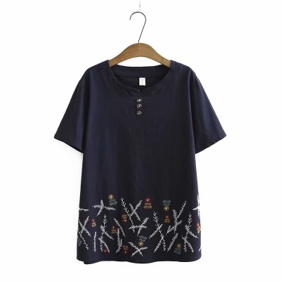 加大码白色红色女式花朵刺绣衬衫短袖夏季衬衫复古上衣